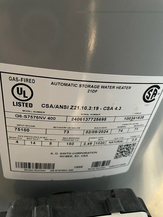 A.O. Smith 75 Gallon Gas Water Heater